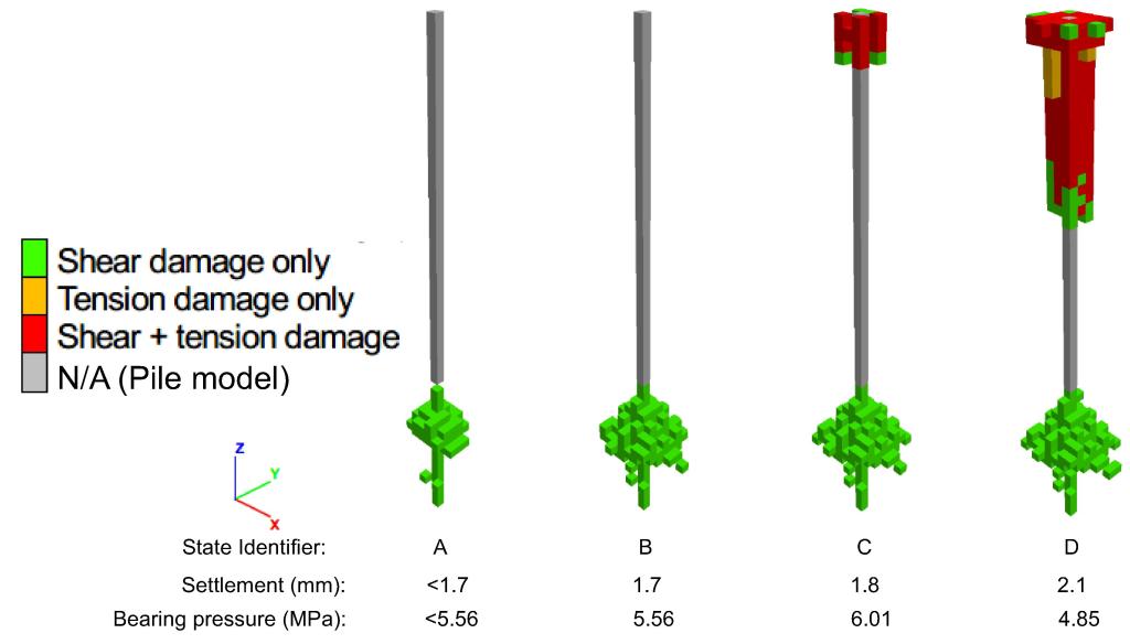 Spatial distribution of mechanical damage around a single pile in multilayer soil, showing four stages of damage: based on FBCM numerical simulation of a full-scale load test of the pile foundation. Each plot shows the pile and soil around the pile that has undergone mechanical damage. Non-damaged soil was excluded from the plot to facilitate visualization of the damage distribution. More information at https://doi.org/10.3390/pr13123836