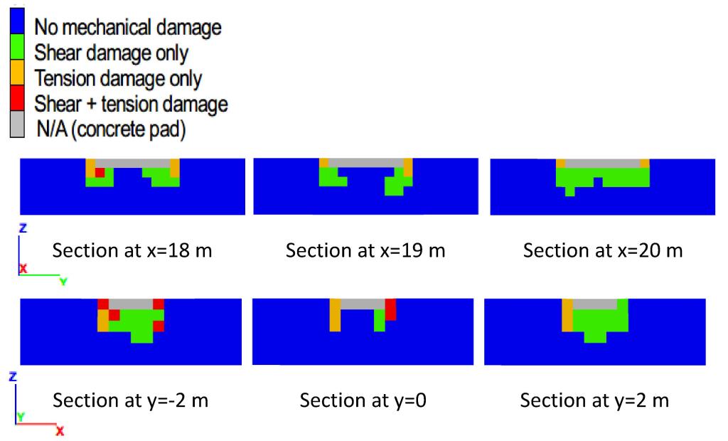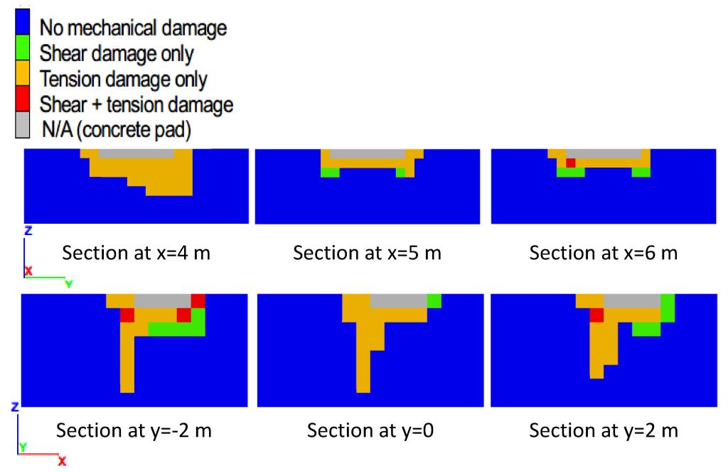 Two perpendicular sections through a concrete pad foundation; showing the spatial distribution of mechanical damage of subsurface materials at the state of peak bearing pressure, for a foundation atop a 45-degree slope with setback of 4 m from the slope crest. A foundation at this setback distance would show tension-dominant failure mechanisms. More information at https://doi.org/10.3390/pr13123836Two perpendicular sections through a concrete pad foundation; showing the spatial distribution of mechanical damage of subsurface materials at the state of peak bearing pressure, for a foundation atop a 45-degree slope with setback of 18 m from the slope crest. A foundation at this setback distance would show shear-dominant failure mechanisms. More information at https://doi.org/10.3390/pr13123836